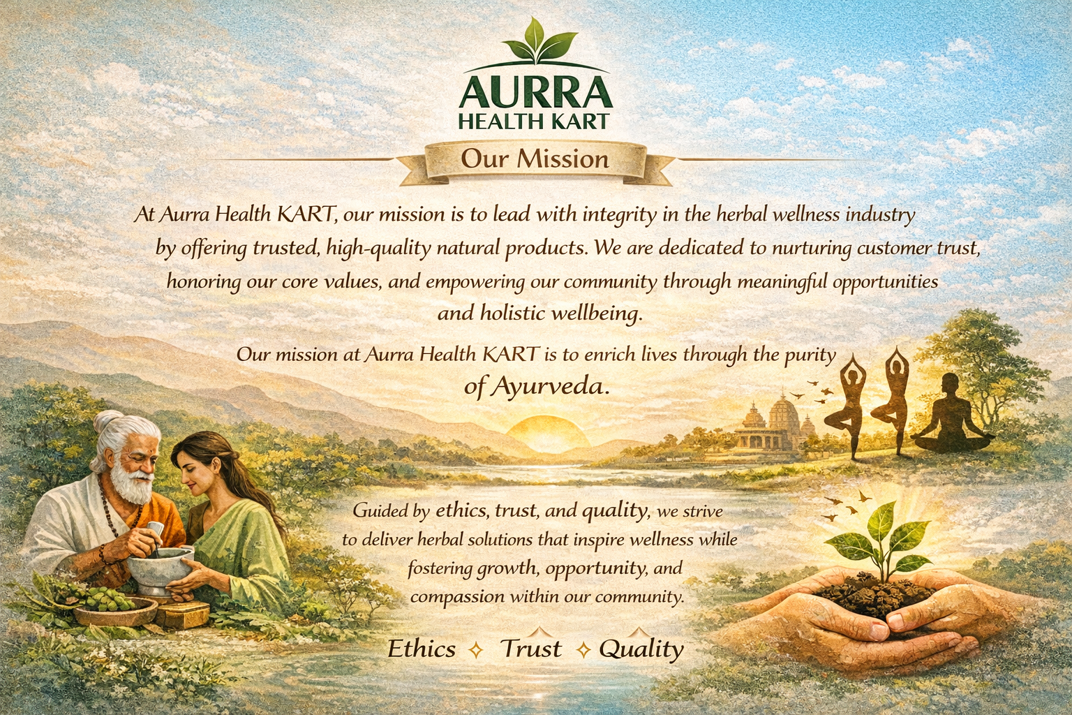 At Aurra Health KART, our mission is to lead with integrity in the herbal wellness industry by offering trusted, high-quality natural products. We are dedicated to nurturing customer trust, honoring our core values, and empowering our community through meaningful opportunities and holistic wellbeing. Our mission at Aurra Health KART is to enrich lives through the purity of Ayurveda. Guided by ethics, trust, and quality, we strive to deliver herbal solutions that inspire wellness while fostering growth, opportunity, and compassion within our community.